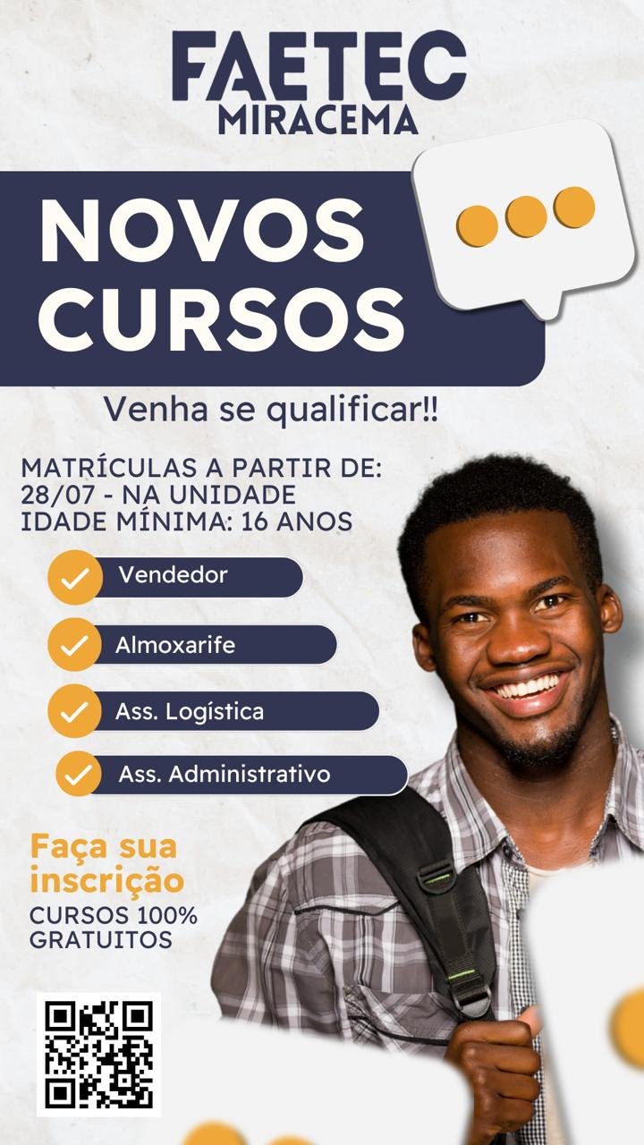 A partir do dia 28 de julho de 2025, estarão abertas as matrículas presenciais para os seguintes cursos: