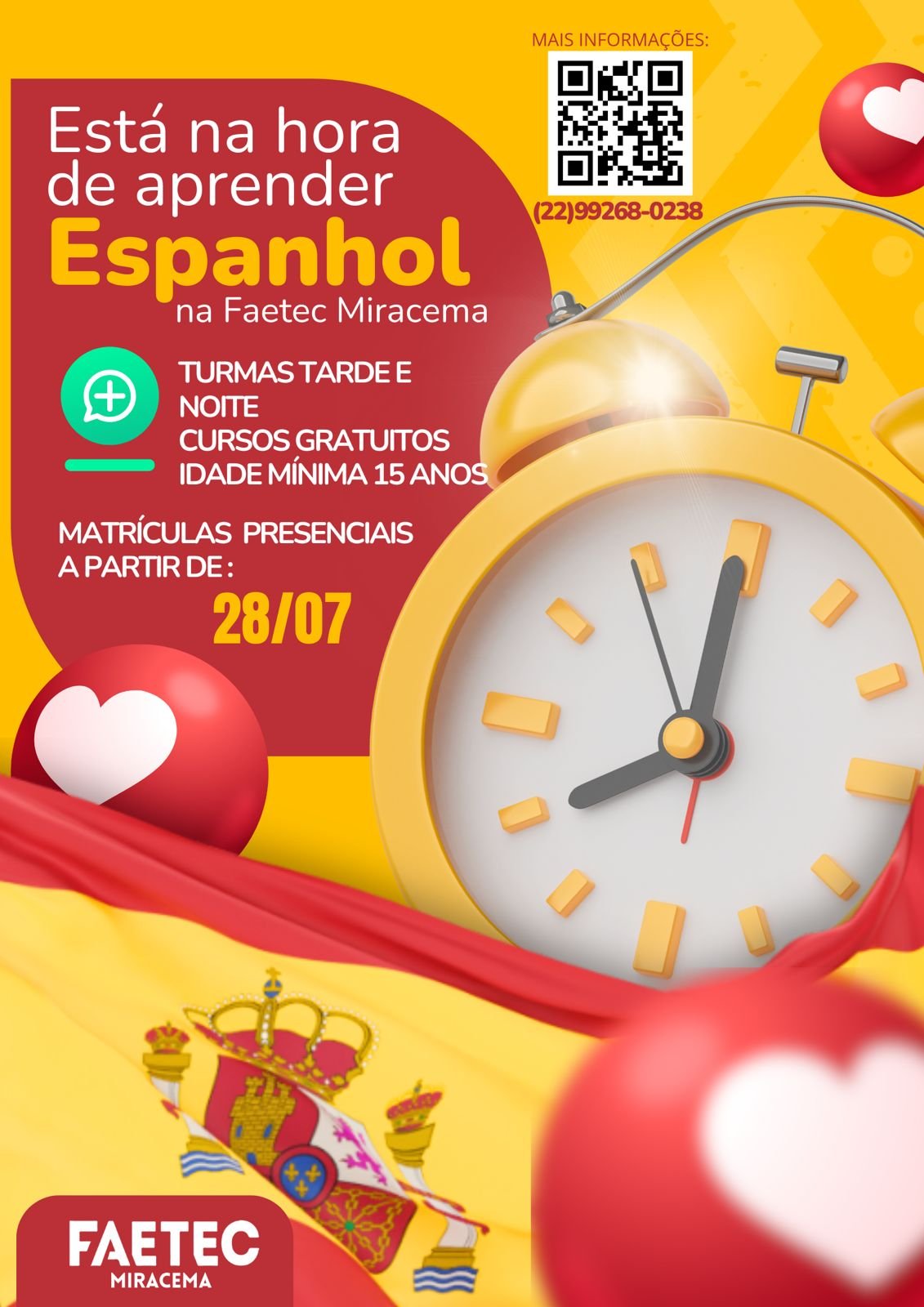 Para quem deseja aprender um novo idioma, o curso de Espanhol terá turmas nos turnos da tarde e noite, com matrículas presenciais também a partir de 28/07/2025.