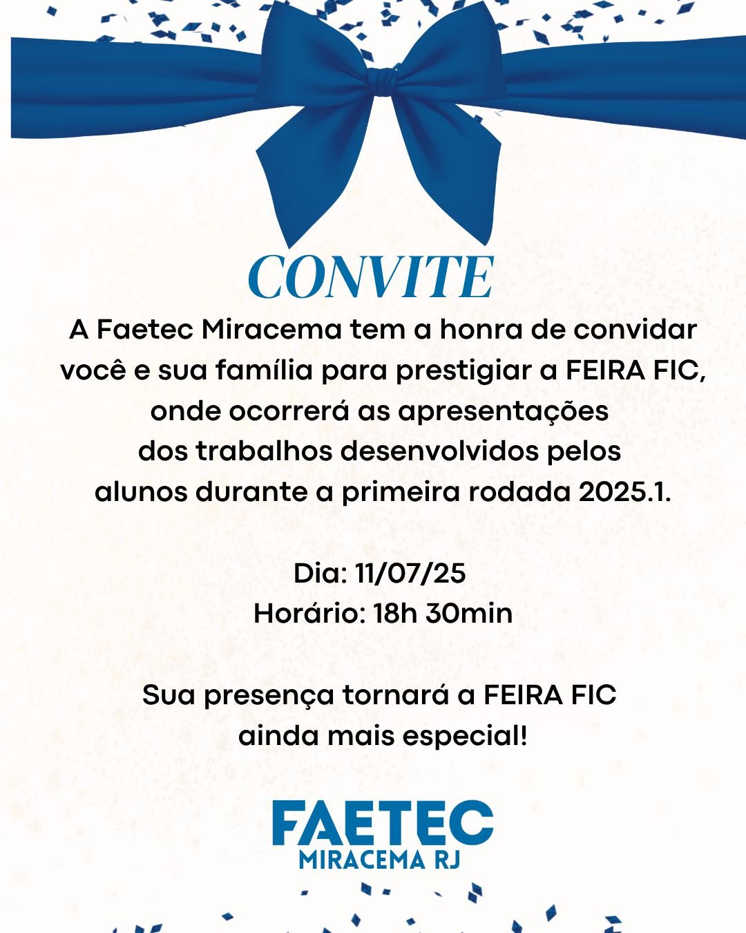 A FAETEC Miracema tem a honra de convidar toda a comunidade para a Feira FIC – Formação Inicial e Continuada, um evento que marca a conclusão da primeira rodada de cursos do semestre 2025.1. A feira será realizada no dia 11 de julho de 2025, a partir das 18h30, nas dependências da própria unidade.